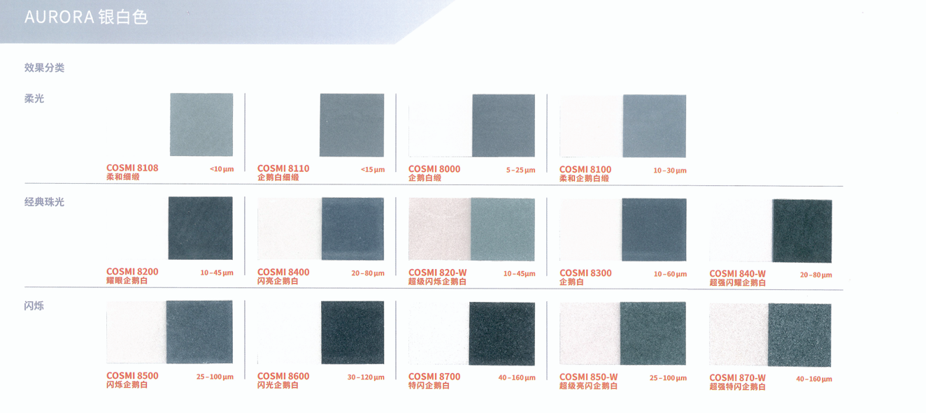 本产品采用合成云母基底,表面结构高度光滑规整,赋予其优异的光学性能。与CosPearl系列相比,其色彩表现更为纯净、鲜艳且闪耀,提供丰富色系选择:包括经典银白、干涉色、金色、金属色,以及高饱和度的黄、橙、粉、紫、蓝、绿、黑等强烈色彩,同时支持定制填料。产品具有高透明度与卓越的反射率,色度饱满且稳定(多数Aurora系列珠光颜料呈现纯白粉末基底,确保色彩还原度)。粒径覆盖小、中、粗多规格,可灵活适配不同妆效需求,广泛适用于化妆品及个人护理产品的开发,尤其适合追求高显色度与光泽感的配方设计。